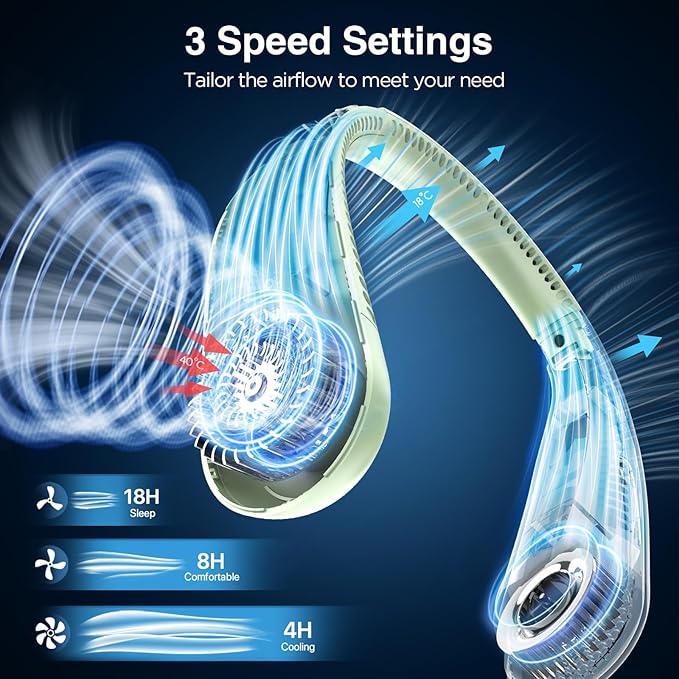 - 【Up to 18 Running Hrs & 3 Speed Settings】The neck fans that blow cool air feature 3 modes (Sleep/Comfortable/Cooling) and 3 speeds from soothing-soft to cooling-strong, you can easily adjust the air flow speed according to your comfort by simply pressing the power button. With a built-in 6000mAh rechargeable battery, the neck fan rechargeable works up to 18 hours continuously in sleep mode (at 40% volume) or 4 hours in cooling mode. A single charge lasts a long time and keeps you cool all day