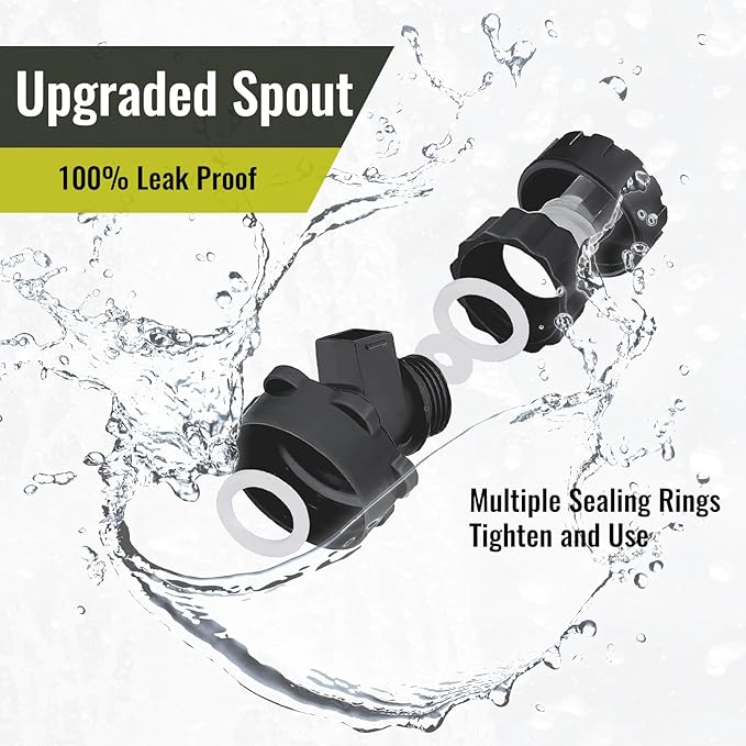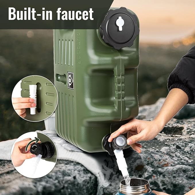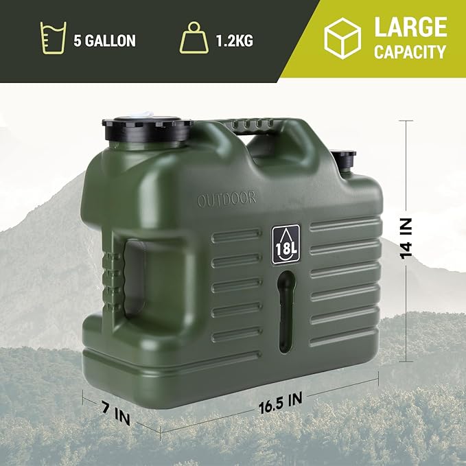 - 【LEAK PROOF】When the 5 gallon water jug is tightly sealed, even if turned upside down for 24 hours, not a single drop will escape; The spigot on the side doesn't leak either; With the sealing ring, the camping water jug won't spill while going down rough trails when full; And the military green water container with spigot won't splash water all over your legs as you walk