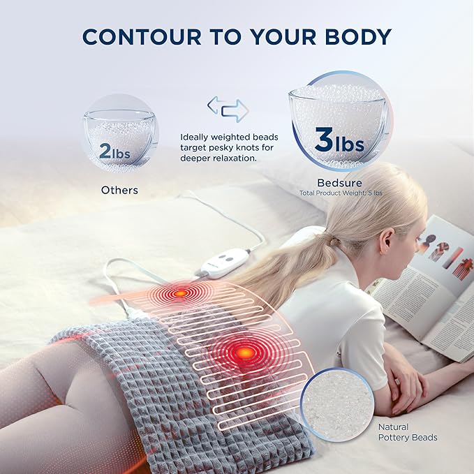 - MASSAGE-LIKE COMFORT: Indulge in a relaxing massage with the 5 lbs Bedsure Weighted Heating Pad, designed with a vibrating function and filled with natural pottery beads. Its blanket-like shape allows you to effortlessly drape it over any area of discomfort, providing instant relaxation and a cozy embrace