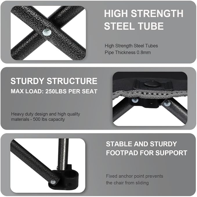 - ✅ HEAVY DUTY CAMPING CHAIR SET DURABLE AND RELIABLE - The LANMOUNTAIN camping chair set is made of thick steel, the double chair has a weight capacity of 600lbs and each single chair has a weight capacity of 250lb, ensuring it can support heavier weights. Its non-slip foot bottom and adaptable design provide stable support on any surface.