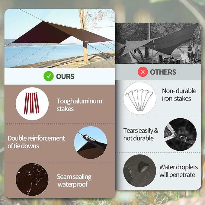 - High-quality complete set of accessories: One set can fulfill your camping needs without having to buy any other items. Package includes 1 tent tarp with 19 webbing straps, 8 rust-proof aluminum ground pegs, 10 adjustable nylon ropes, 1 ultralight carry bag for all your belongings, plus a super handy extra carry bag for accessories