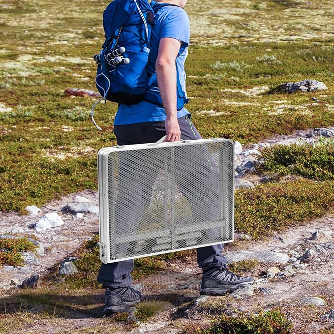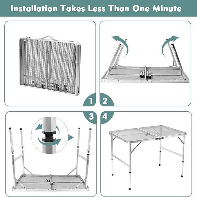 - [Robust and Sturdy] The folding table is made of high-quality aluminum alloy, ensuring its sturdiness and durability. The table top is designed with a metal mesh surface and has been treated with a thickened paint coating, allowing it to withstand prolonged exposure to high temperatures. When stored in the garden, it is resistant to rain and snow, as the limited contact area with the table surface minimizes the risk of staining and rusting