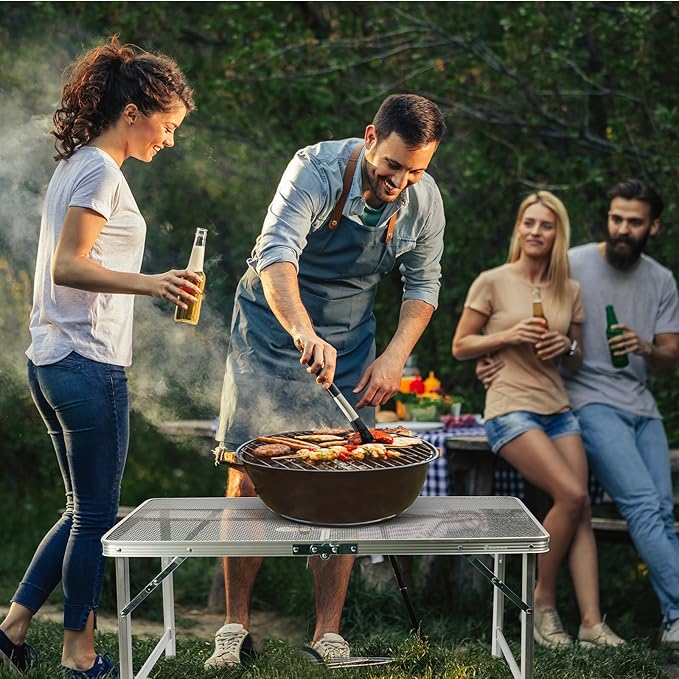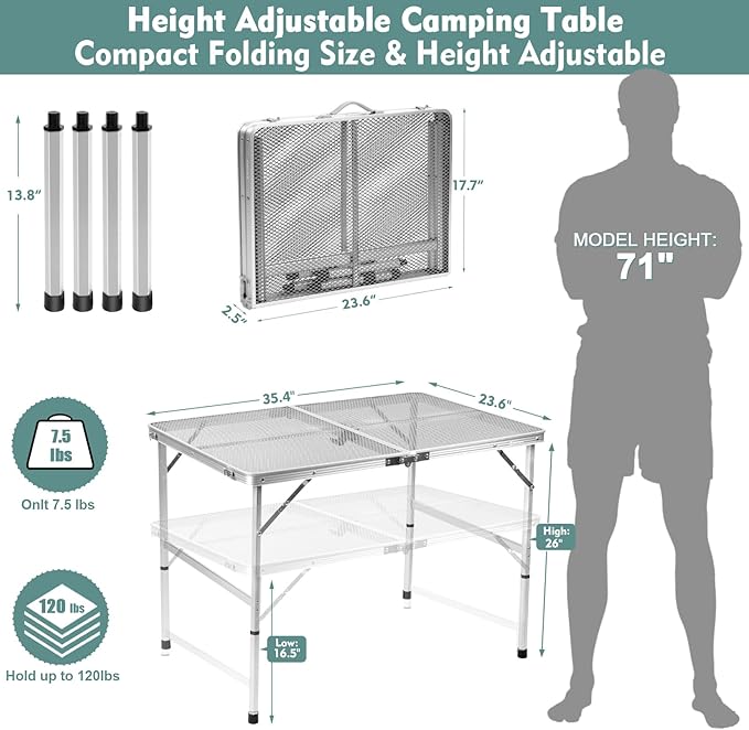 - [Adjustable Grill Table]The folding camping table allows you to adjust the height of the camping table from an initial height of 16.5 inches to a height of 22 inches,providing a perfect surface for you to picnic on the grass or grill standing up