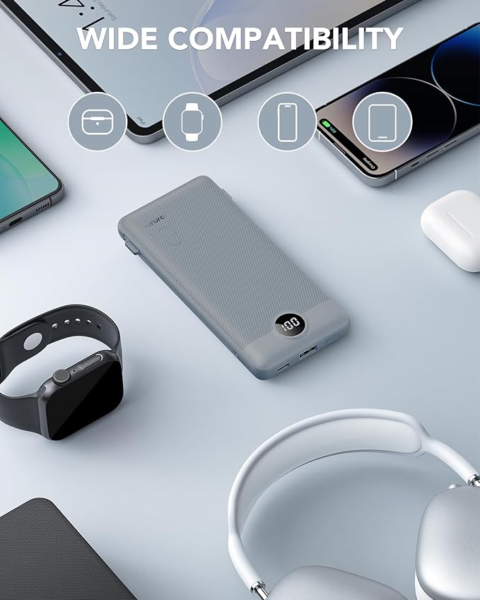 - [High Capacity & Universal Compatibility] Boasting a 10,000mAh capacity, this USB-C portable charger can power your devices 2.5 to 4 times on a single charge, depending on the device. It's compatible with iPhones, Android devices, and most USB-C enabled gadgets using the built-in cables.