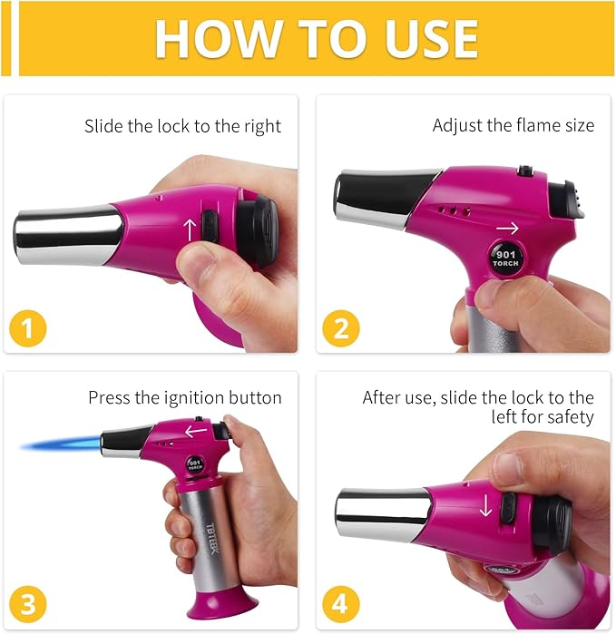 - Safe and Sturdy Creme Brulee Torch: The safety lock could prevent accidental ignition. Also the ergonomic design provides comfort to your hand and keep away from the flame; the aluminum alloy material adopted makes it more resistant and sturdy, ensuring the longevity
