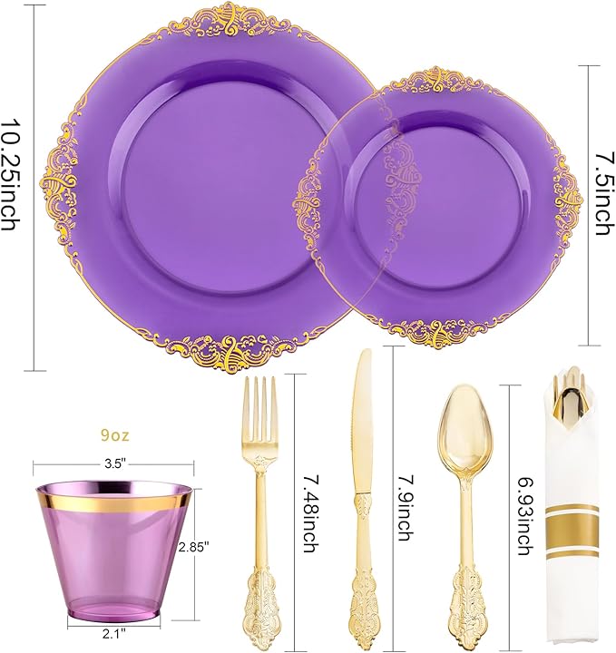 - 25 Guest Set: The clear plastic plates include 25 dinner plates, 25 salad plates, 25 knives, 25 forks, 25 spoons, 25 cups, 25 napkins. Purple disposable plates are packed in a solid gift box. The set of gold party plates will allow you to entertain 25 guests.