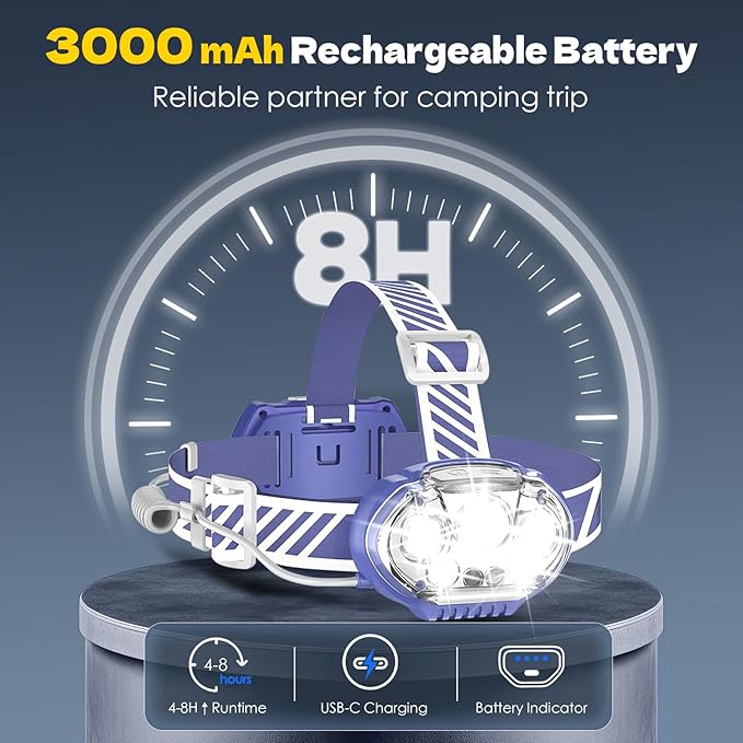 - USB Rechargeable and Long Battery Life: Do not use unsafe cylindrical batteries! Our rechargeable headlamp usa built-in rechargeable batteries to ensure your safety first. Our head lamps support Type-C USB charging, making it convenient for everyday use. The headlamp rechargeable can provide 4-8 hours of long-lasting power in different lighting modes, so you can adventure without worrying about running out of juice