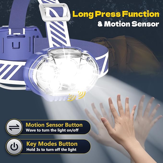 - Long Press and Motion Sensor: In any mode, press the on switch button for 3 seconds, the rechargeable headlamp flashlight will turn off directly, no need to cycle through all the modes. The headlights for head is also equipped with the smart motion sensor, which easily controls the headlamps for adults on and off with a wave of your hand, more convenient for your work