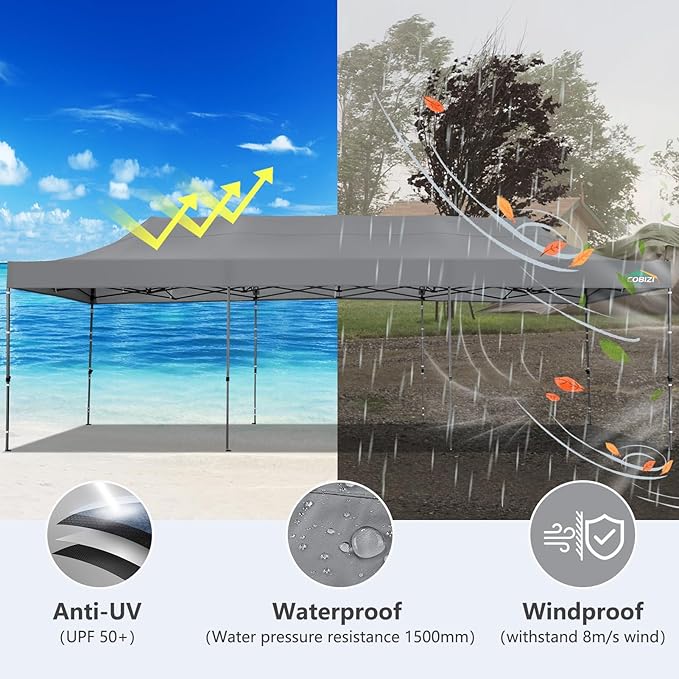 COBIZI 10x30 Pop up Canopy, Heavy Duty Outdoor Party Tents for Parties, Ez up UPF 50+ Waterproof Commercial Canopy with Wheeled Bag can fold, Gray(Windproof Upgraded)