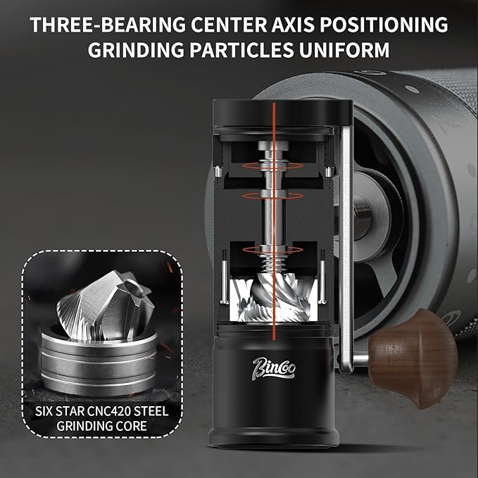 - Premium Six-Star CNC Steel Burr:Equipped with a cutting-edge CNC steel burr, the three-axis bearing ensures a uniformly ground coffee texture, creating a rich and three-dimensional flavor profile.