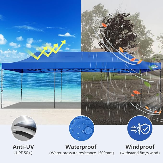 COBIZI 10x30 Pop up Canopy, Heavy Duty Outdoor Party Tents for Parties, Ez up UPF 50+ Waterproof Commercial Canopy with Wheeled Bag can fold, Blue(Windproof Upgraded)