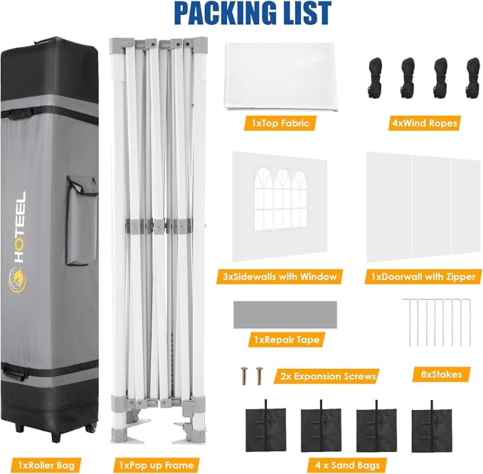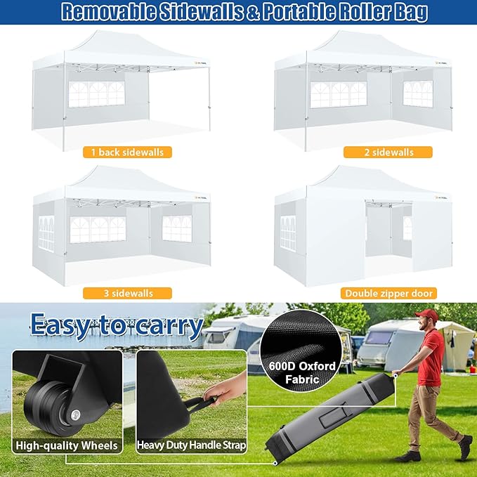 - ๐ใ๐๐๐ฌ๐ฒ ๐๐ฌ๐ฌ๐๐ฆ๐๐ฅ๐ฒ & ๐๐จ๐ซ๐ญ๐๐๐ฅ๐ ๐๐จ๐ฅ๐ฅ๐๐ซ ๐๐๐ ใ HOTEEL 10x15 pop up canopy is easy to set up and close , no additional tool required, 1-2 people can assemble it in 1-2 minutes. And this party tent equipped with a 600D Oxford fabric portable roller bag, make sure you can take the outdoor canopy any where and stow in your car trunk easily.