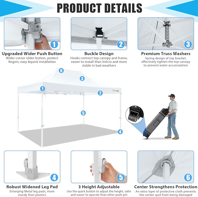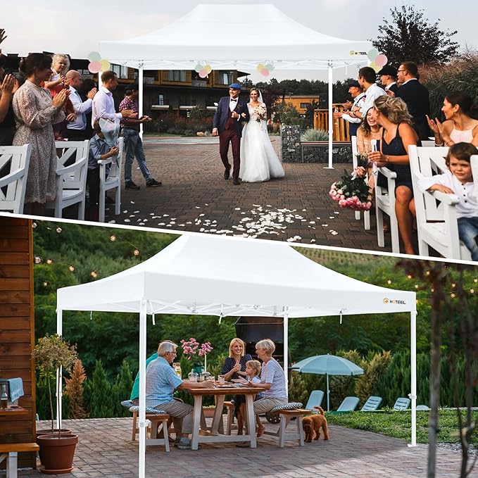 - UPGRADED HIGHER CANOPY: HOTEEL Heavy Duty Canopy tent 10x15 can be quickly installed by 2 people in minutes without tools. Large outdoor tent for parties enough to accommodate 20-30 people easily. Adjust 3 different heights (128 inches, 132 inches, 135 inches) with the upgraded thumb button. The larger button is easy and smooth to lock and release, to prevent pinched fingers.