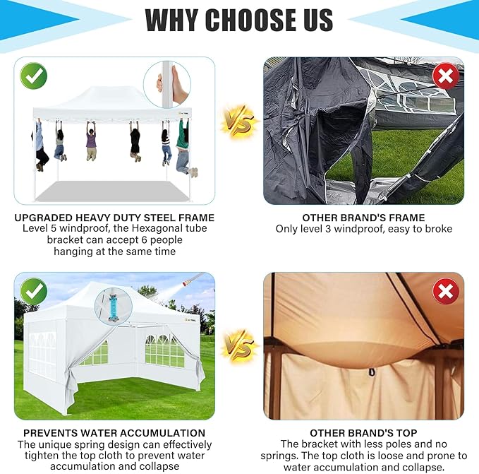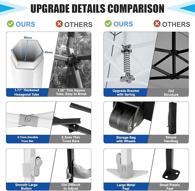 - UPGRADE THICK HEXAGONAL PIPE HEAVY DUTY CANOPY FRAME: Hoteel 10x15 Pop Up Canopy Tent is made of a commercial-grade full truss structure, durable and rustproof. Upgrade Spring Design of the top bracket, tighten the top cloth and effectively reduce water accumulation. Upgrade thickened hexagonal tube, which diameter is 1.77'' (45mm) and thickness is 0.03''/0.7mm, while most party tent are only 0.98'' in pipe diameter and only 0.02'' tube thickness