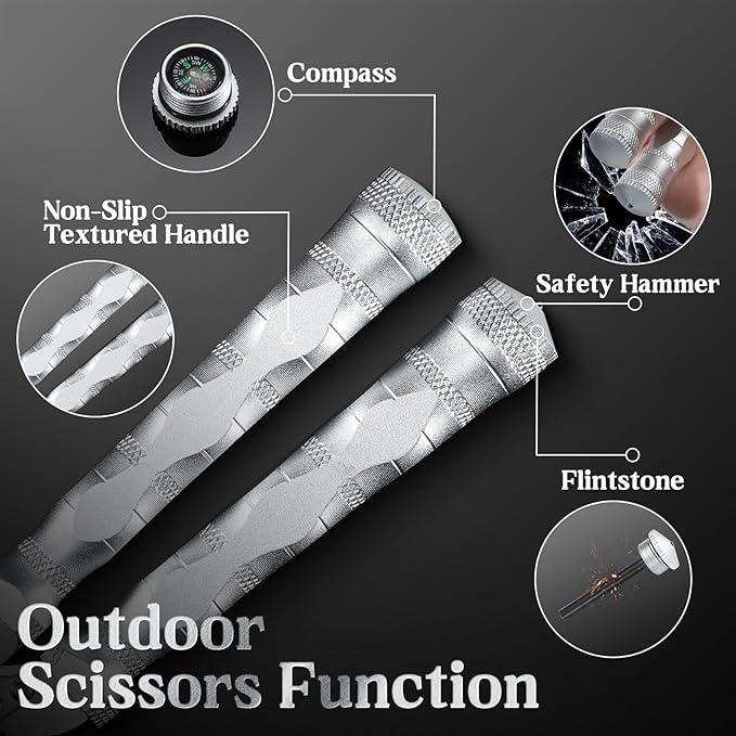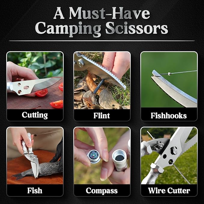- CAMPING POULTRY SHEARS -- Professional multipurpose poultry scissors come with extra features. Bottle opener in the blade for fast & easy opening of bottles and jars.The handle also features an integrated compass and flint, making it perfect for outdoor camping. These sharp shears can even be used as wire cutters, fish hooks and window breakers.