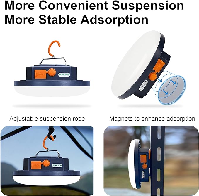 - ๐ใConvenient to Useใ Hands free, this camping light comes with a hook and magnet on the base, which allows you to hang the tent light upside down to get better light when lighting a large area. Please pay attention to check whether the magnetic suction is firm to prevent falling.