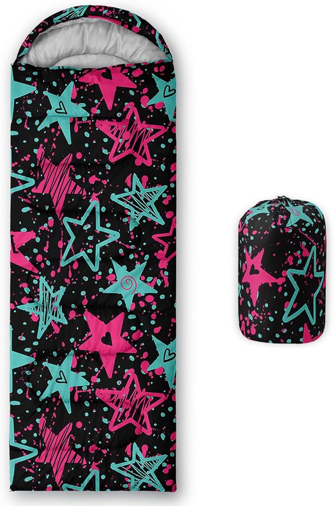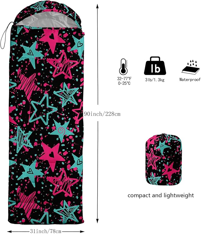 - 【Fits For 3 Seasons】: Size - 31 by 90 inches (W x D). Our Graffiti Style Stars sleeping bag can be used in 3 seasons with a design temperature of 32℉-77℉(0℃-25℃). These Cartoon Stars bags also have a weather resistant waterproof design to keep you warm and prevent you from any dampness.