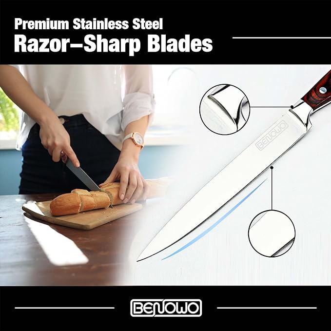 - [VERSATILE AND DURABLE]: Whether you're carving a succulent roast, slicing a hearty steak, or delicately portioning poultry, this set is versatile enough to handle a variety of meats. The durability of the materials ensures long-lasting performance in your kitchen.