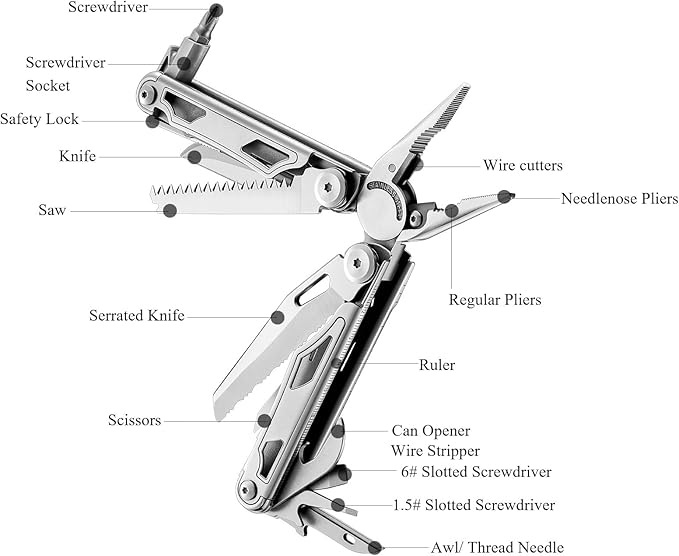 - 18 in 1 Multitool: includes needle nose pliers, pipe clamp pliers, tungsten alloy cutters (replaceable), knife, wood saw, rope cutter, scissors, can opener/wire stripper, Eyeglass screwdriver, 6# slotted screwdriver, hole punch, PH1 Phillips screwdriver /5# slotted screwdriver, screwdriver sleeve, scale