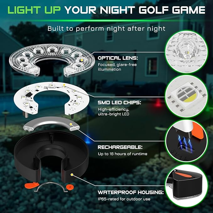 - Optimized Lighting: High-efficiency LED beads with a patented optical lens for focused, soft illumination, preventing glare and light pollution, and maintaining comfortable visibility for golfers.