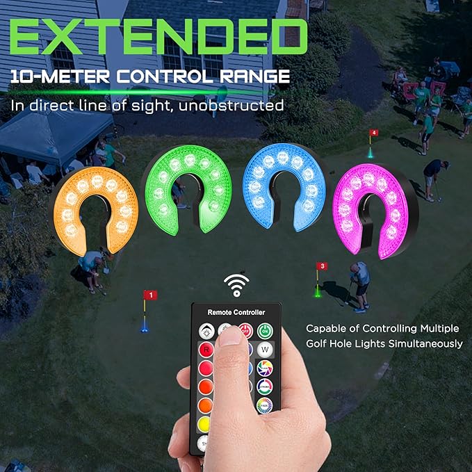 - IP65 Rated: Designed with waterproof capabilities to stay in the golf hole rain or shine with a remote timer for customizable lighting schedules.