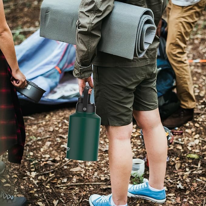 Half Gallon Water Bottle Insulated(Cold for 48 Hrs),BPA Free&Leak Proof,64oz Stainless Steel Water Jug/Flask,Big thermo,Large Water Bottle with Handle for Gym,Hiking,Camping,Dark Green