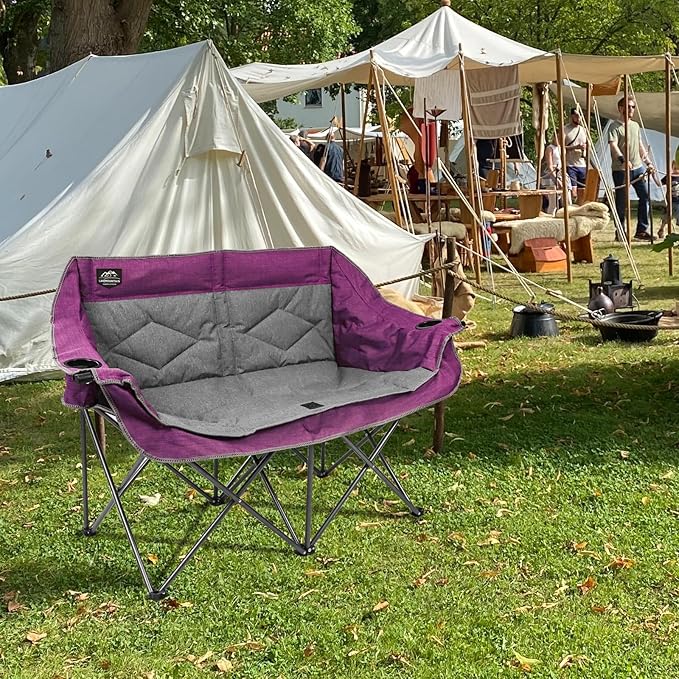 Folding Loveseat Camping Chair,Portable Double Chair w/Cup Holder,Wine Glass Holder,Carry Bag Heavy Duty Lawn Chair for 2 Adults,Perfect for Camp,Hiking,Picnics and Beach Trips,Purple
