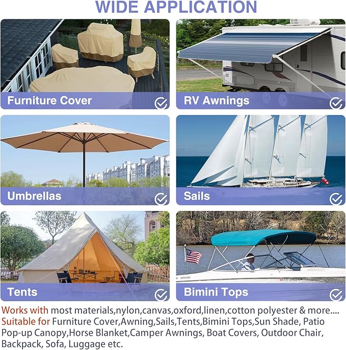 - The super strong adhesive is not easy to come off, and remains firmly adhered to outdoor fabrics and materials, including canvas, oxford cloth, polyester, nylon, vinyl, linen, cotton, etc., in extremely cold and hot weather below zero degrees Celsius. Repairs virtually any camping gear surface by sticking to it, including tents, patio umbrellas, RV awnings, grill covers, boat covers, outdoor furniture covers, bimini tops,sail,hammocks,sleeping bags, backpacks, luggage, ski jackets, etc