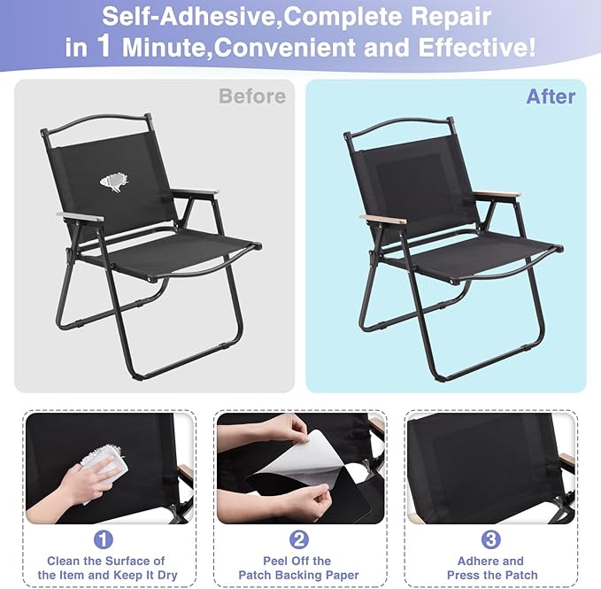 - REPAIR ALL KINDS OF OUTDOOR GEAR IN 30 SECONDS: No sewing or ironing required, just remove the liner, stick it on the torn surface and apply pressure. Fast and efficient, can be the best choice for emergency repair of outdoor equipment