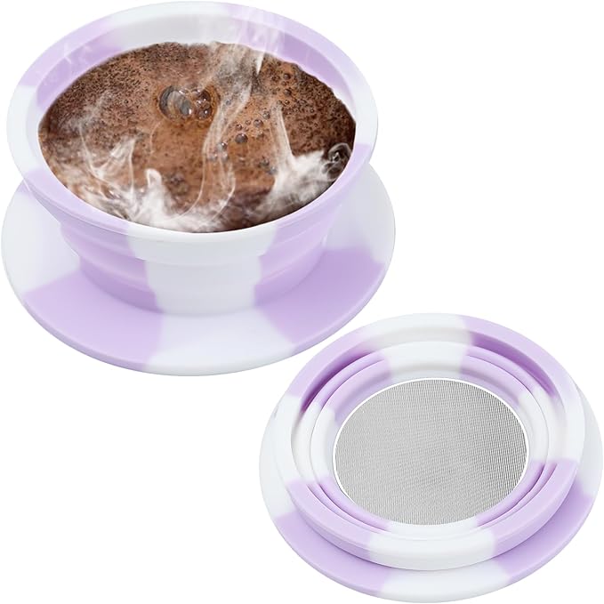 - [Reusable and Lasting]: Made from food-grade silicone and reusable fine stainless steel mesh filter, the reusable coffee strainer?can be reused?and built to last. The reusable extra-fine metal mesh Screen filter at the bottom enusres no grounds end up in your cups