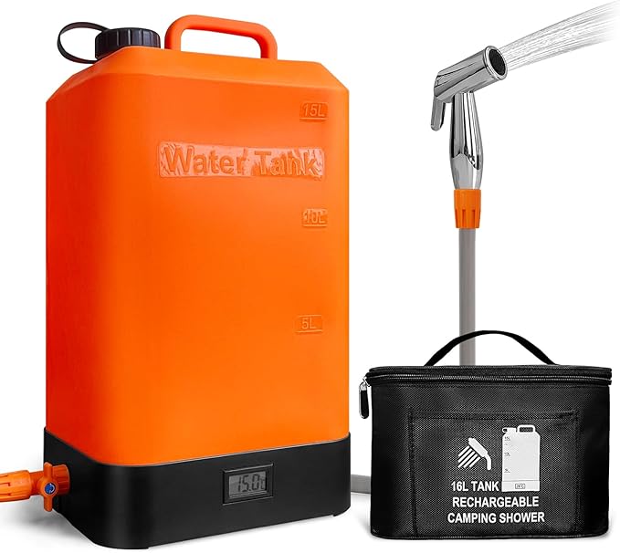 B. TAWD 4.5 Gallon Silicone Water Tank, Portable Camping Shower, USB Battery Charging, Solar Heating, with Shower Head, Electric Portable Outdoor Shower, Built-in Thermometer, Beach, Camping, Hiking
