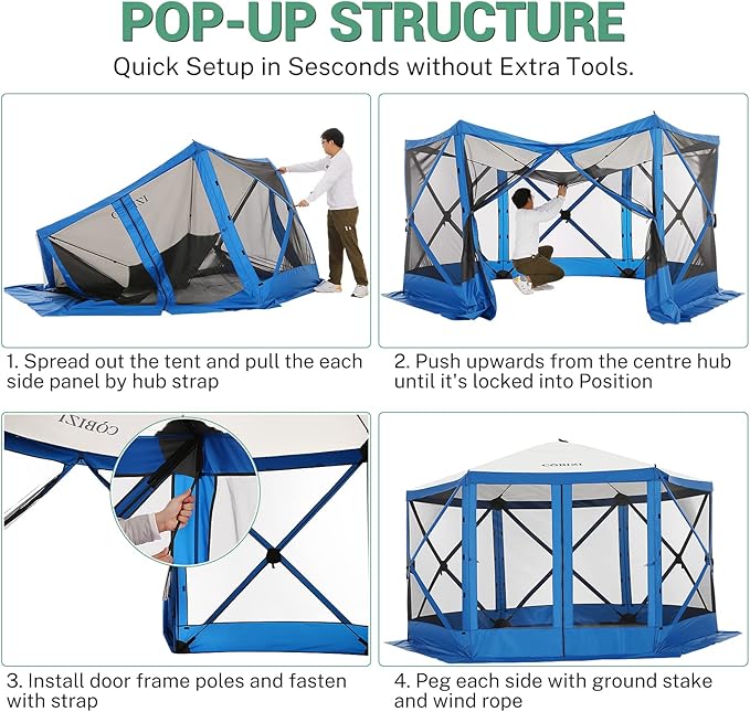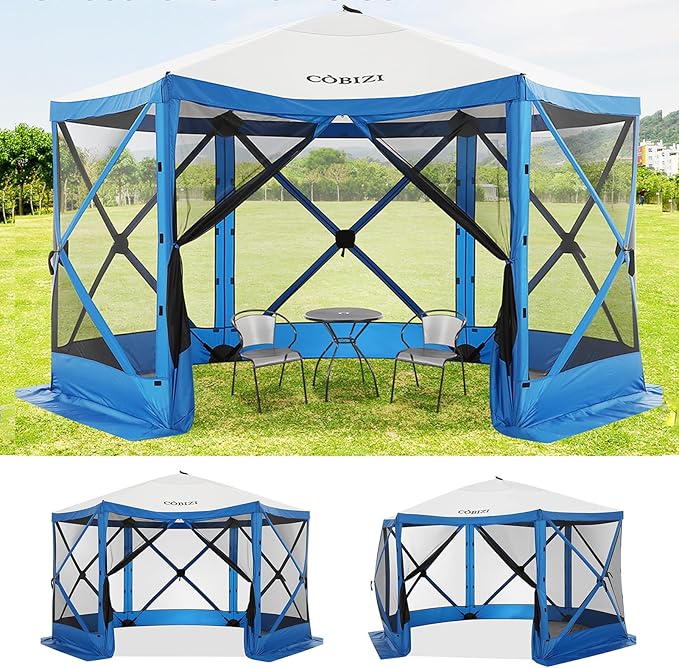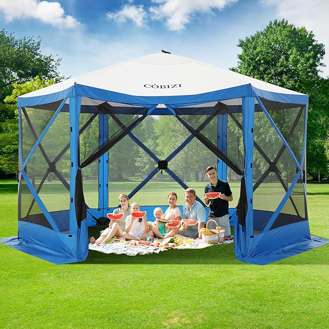 COBIZI 12x12ft Pop up Gazebo Screen House Tent for Camping, Camping Outdoor Screened Gazebo with Mosquito Netting, Portable Hub Tent with Carrying Bag and Ground Stakes, Blue(Upgraded 2.0)