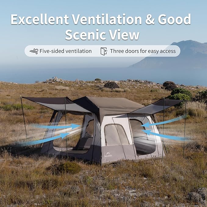 - Great Ventilation & Good View: It is a good ventilation tents for camping ,with five-sided ventilation: 3 big windows enjoy more air flow and great view, 3 large doors for easy access and ventilating, top mesh skylight also provide a great night view when open the rainfly.