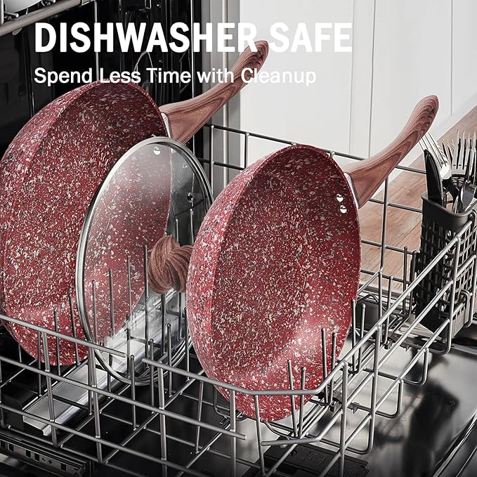 KOCH SYSTEME CS 12" Red Granite Non-Stick Frying Pan with Lid, Classic Pans with Non-toxic Nonstick Coating, Aluminum Skillet with Heat-resistant Bakelite Handle, Induction Compatible Frying Pan