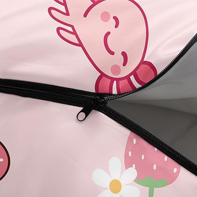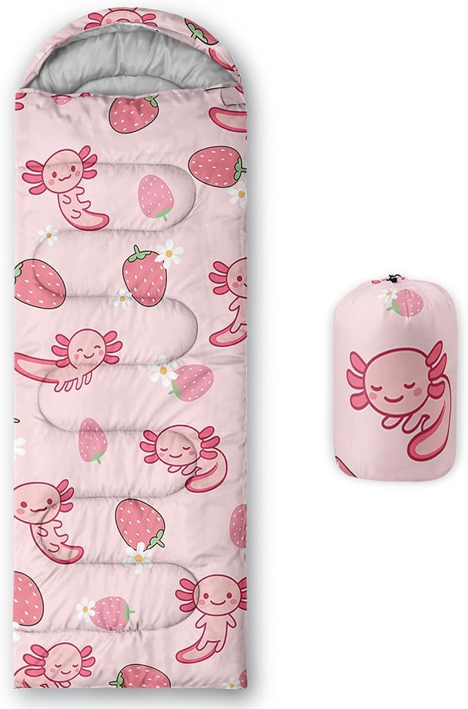 - 【Fits For 3 Seasons】: Size - 31 by 90 inches (W x D). Our Axolotl Strawberry sleeping bag can be used in 3 seasons with a design temperature of 32℉-77℉(0℃-25℃). These Sleeping bags also have a weather resistant waterproof design to keep you warm and prevent you from any dampness.