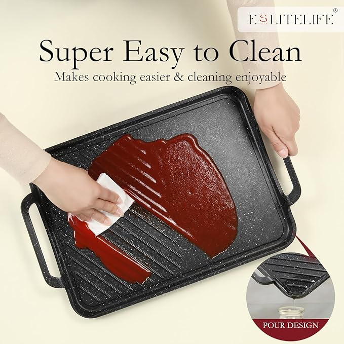 - Eco-friendly Non-Stick Granite Coating & Super Easy to Clean - Our griddle pan interior is coated by non-stick granite coating, SGS approved, 100% PFOA free. Require less oil or butter for cooking and minimal scrubbing for a spotless clean, giving you a healthier and more enjoyable at-home cooking experience.