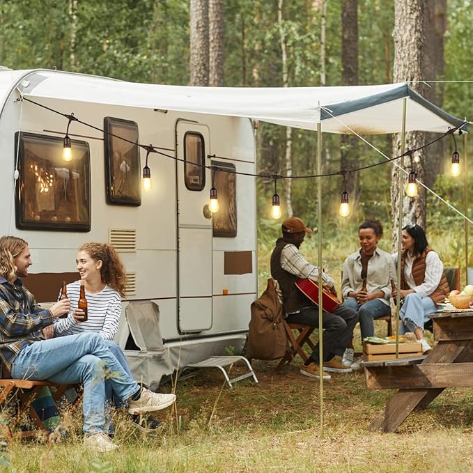 - 2 Pack Dimmable Outdoor String Lights with Remote: Our 2 Pack 48 feet 15 hanging sockets (totally 96 FT 30 sockets) led string lights contains 34 (15 per string) led plastic bulbs (4 spare), retro Edison warm white LED bulbs with 3.15 ft bulb spacing, creating a soft and cozy glow to your space. Easy to control the light within 10 meters by remote, no need to manually unplug the string to turn it off. Connected up to 3 string with circular connection in the string light end