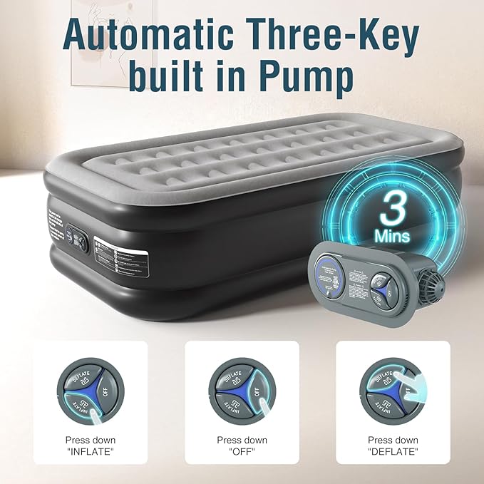 - Excellent Sleeping Experience: The top of 18 inch twin blow up air mattress is made of high quality flocked fabric, which is waterproof, odor-resistant and easy to clean. Sleeping on this twin air mattress bed with built in pump will not only provide you with a skin-friendly soft feeling, but also like mother giving you a kind hug