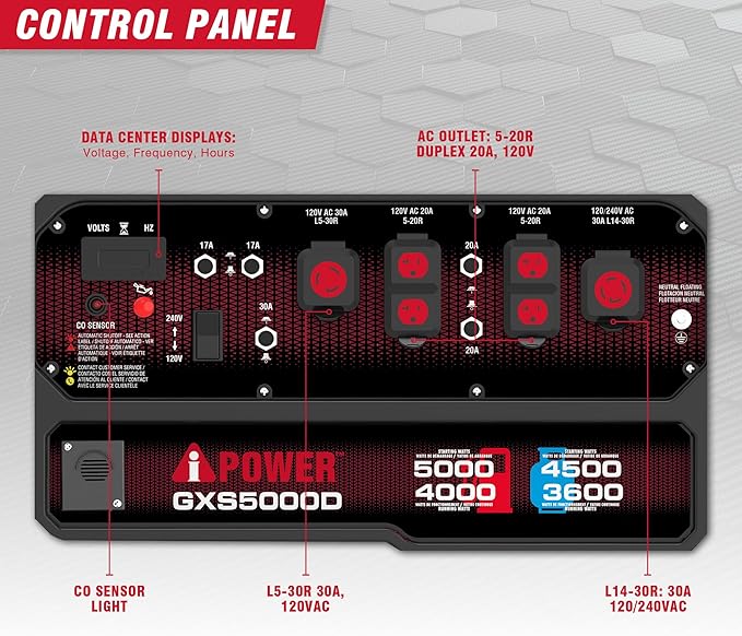 - Multi-featured control panel: the control panel consists of CO sensor indicator light, data center display, 2 x 5-20R duplex 20 Amp 120-Volt, 1 x L5-30R 30 Amp 120-Volt, 1 x L14-30R 120-Volt/240-Volt 30 Amp twistlock