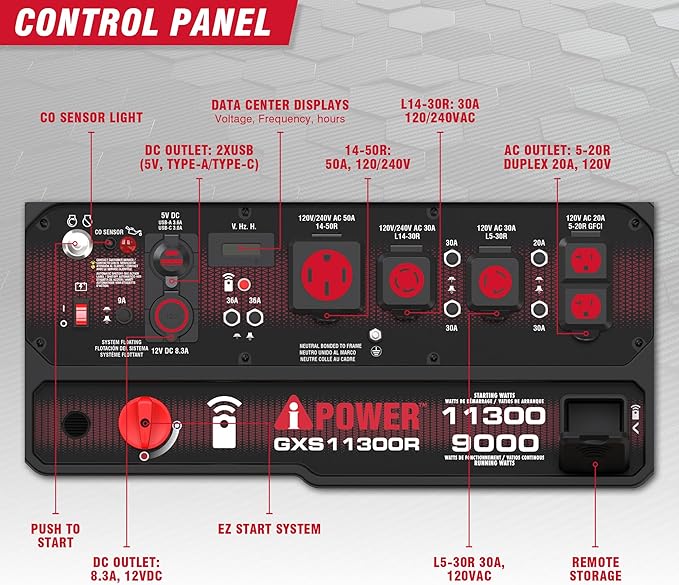 - Multi-featured control panel: the control panel consists of CO sensor indicator light, digital data center, electric push button start, remote fob storage, 1 x 5-20R duplex 20 Amp 120-Volt, 1 x L5-30R 30 Amp, 120-Volt, 1 x L14-30R 30 Amp 120-Volt/240-Volt, 1 x 14-50R 50 Amp, 120-Volt/240-Volt, 1 x 8.3 Amp 12-Volt DC automotive outlet, 1 x USB-A 3.6A, 1 x USB-C 3.0A