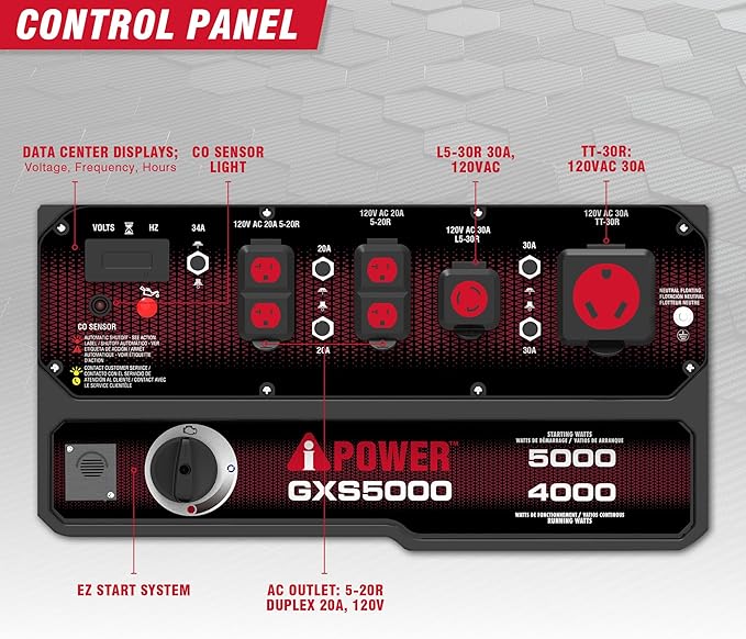 - Multi-featured control panel: the control panel consists of CO sensor indicator light, data center display, 2 x 5-20R duplex 20 Amp 120-Volt, 1x L5-30R 30 Amp 120-Volt, 1 x TT-30R 30 Amp 120-Volt