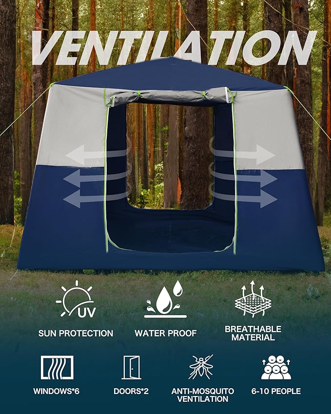 - 【EXCELLENT VENTILATION】The inflatable tent is equipped with 6 windows and 2 doors, it provides ample airflow to keep the interior cool and comfortable. Enjoy natural light and fresh air, making your outdoor experience even more enjoyable. The windows and doors also offer easy access in and out, adding convenience to your camping. Choose now for a comfortable camping adventure!