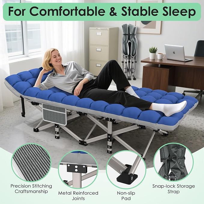 Suteck Camping Cot, Folding Camping Cot Bed for Adults Sleeping 1200D Double Layer Oxford Portable Folding Outdoor Cots for Camping W/Soft Pad Carry Bag for Home Office Nap Beach Travel, Stripe Blue