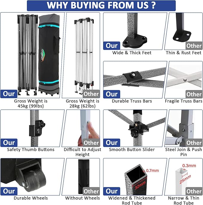 - 【Packing List & After-sale Protection】Pop up canopy 10x20 tent Top Cover x 1, Pop Up Canopy Frame x 1, Sidewall with Zipper x 2, Sidewall with Window x 4, Sandbag x 4, Ground Nails x 12, Ropes x 6, Wheeled Storage Bag x 1. We have a professional service team and provide 24/7 customer service to help you with any questions or queries you may have while using COBIZI products. One year after-sale protection for the canopy frame; Six months after-sale protection for fabrics and accessories.