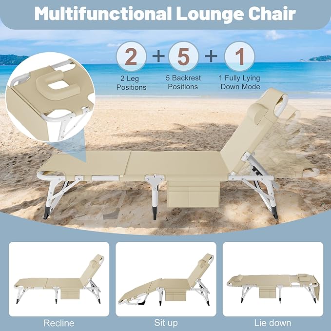 - Versatile Comfort: Our design includes a open/close face cavity and arm holes, offering flexibility for lounging on your back or stomach. With 5 adjustable positions, it transforms into your personal oasis – a portable tanning bed, a massage table, or a convenient reading chair on the go