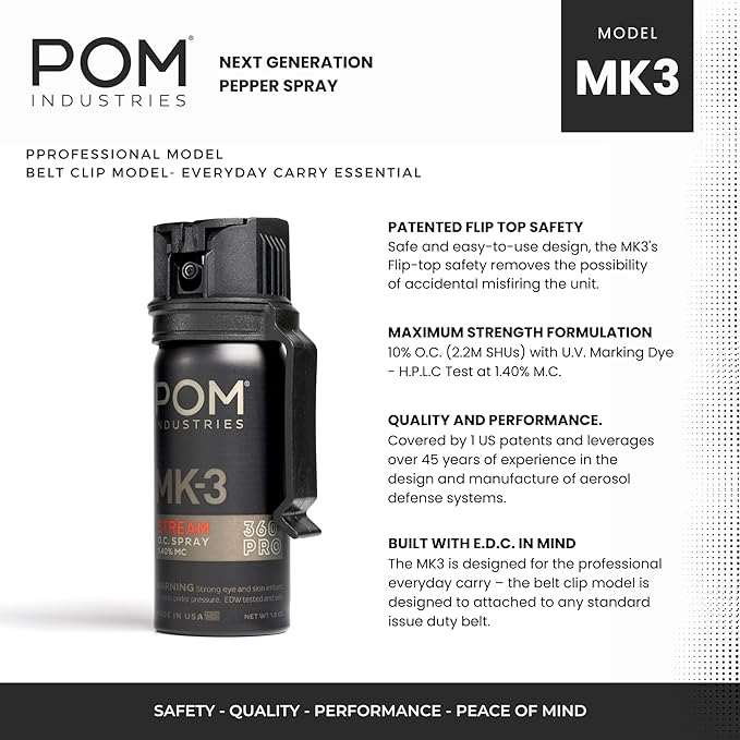 POM MK3 Pepper Spray, Belt Clip Model, Maximum Police Strength OC with UV Marking Dye, Quick Flip Top Safety, 360° Performance at Any Angle, Powerful Accurate Stream, 18 ft Range, 1.8 fl oz