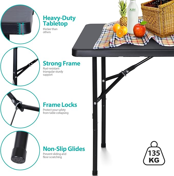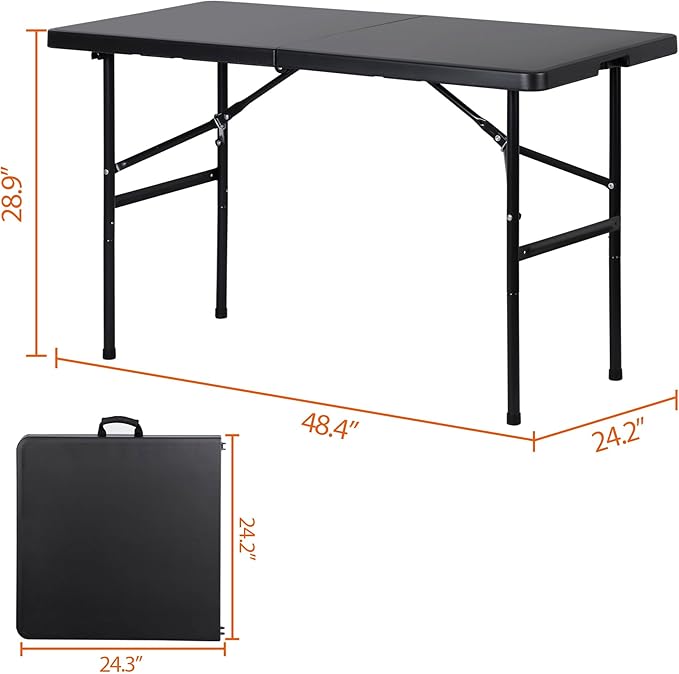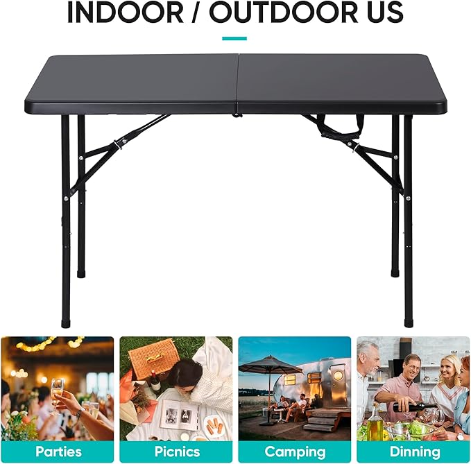 SUPER DEAL Portable 4 Foot Plastic Folding Table, Indoor Outdoor Heavy Duty Fold-in-Half Picnic Party Camping Barbecues Table with Carrying Handle, Black