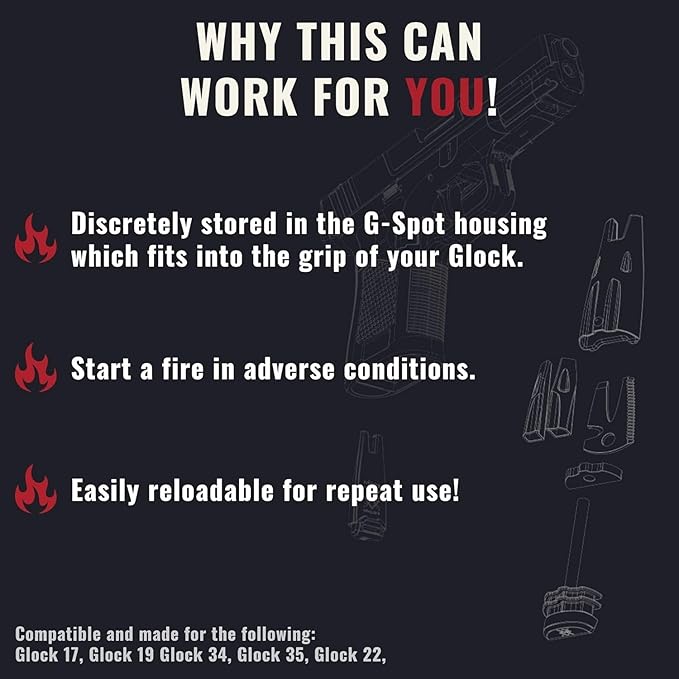 - COMPATIBLE WITH MULTIPLE MODELS: Compatible with the Glock 17, 19, 22, 31, 32, 34, 35, 45, 47 & 49. This survival fire starter kit makes a great Glock accessory.