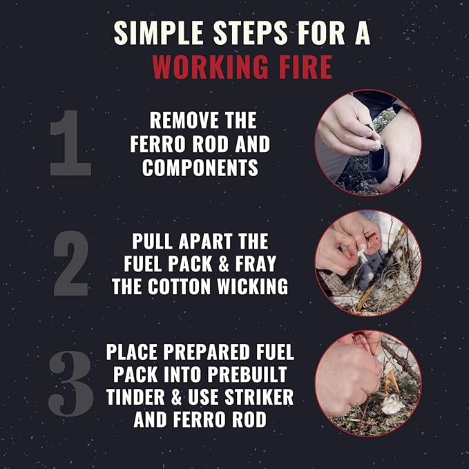 - Included Components : The kit comes with: a housing, multipurpose metal striker, a ferro rod with base cap, one pair of tinder fuel rods with proprietary blend to start fires easily in harsh conditions and provide a burn up to two and a half minutes. The kit comes with: a housing, multipurpose metal striker, a ferro rod with base cap, one pair of tinder fuel rods with proprietary blend to start fires easily in harsh conditions… See more