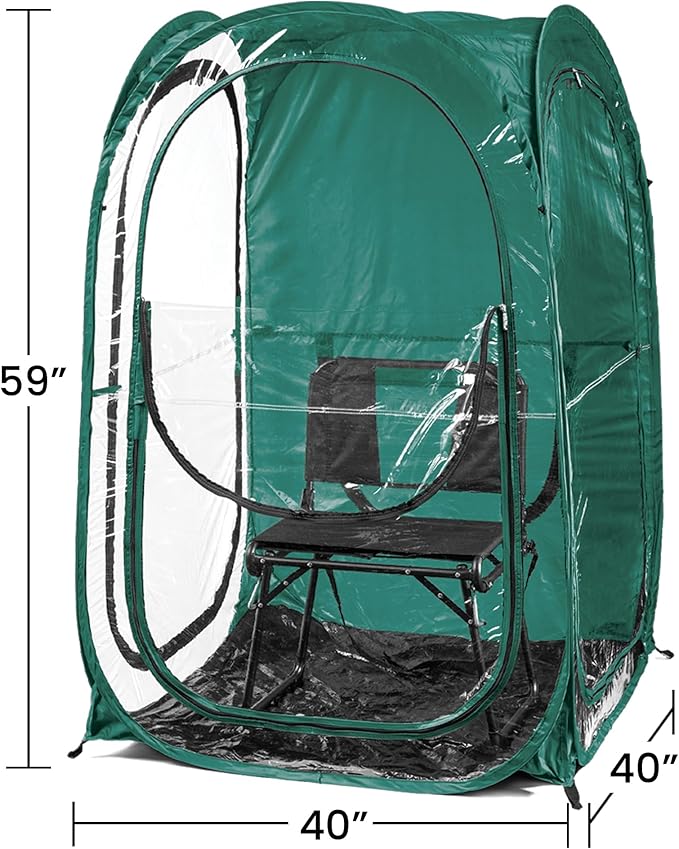- The Original Weather Pod: Slightly bigger than our 35x35 modular Pod, the Large 1-Person Pod’s patented bubble is big enough to fully cover one adult in a folding camping chair, with plenty of legroom and space for a tote bag or small cooler